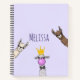 A spiral notebook with a cute graphic illustration featuring 3 curious llamas. One llama is wearing a crown and blowing bubble gum. The other 2 are standing off to the side, with only their head and necks visible, peering over at you. Light purple background.