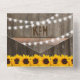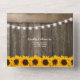 A 3 in 1 rustic country chic wedding trifold invitation featuring a rustic wood barrel background, twinkle string lights, bright yellow sunflowers, your monogram, wedding details, wedding invite, and a meal rsvp postcard for your guests to tear off and send back.
