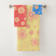 3 Pack Colourful Retro Floral Pattern Bath Towel Set. Vintage, cute and playful orange colour floral pattern. Mix and match of yellow, bright blue and red background colours. So cheerful, modern and summery!