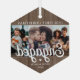 Celebrate the joyful 1st holiday of your engagement with a custom 3 photo collage "Our First Christmas Engaged" faux wood hexagon-shaped glass ornament. All wording and images on this template are simple to personalize. (IMAGE PLACEMENT TIP: An easy way to centre a photo exactly how you want is to crop it before uploading to the Zazzle website.) As an idea, the script typography can read "Together" or "Married." The modern farmhouse style design features rustic brown faux wood, stylish calligraphy, the couple's names & year, and three pictures of your choice. This unique wedding keepsake adds an elegant touch to Xmas home decorations.