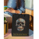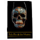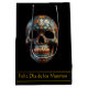 Present your gifts with captivating artistry using this striking gift bag featuring the detailed 3D Day of the Dead skull design. The design showcases a black base, richly adorned with vibrant and intricate floral and scroll patterns in contrasting metallic gold, teal, and copper, embodying the spirit of Día de los Muertos. These traditional sugar skull decorations include stylized marigolds (cempasúchil), the iconic flower of Día de los Muertos, along with swirling vines and symbolic flourishes. The metallic accents give the skull a dimensional, almost embossed appearance, making these culturally significant details truly pop. Across the bag, a prominent banner provides a customizable text field, allowing you to add a recipient's name, a short message, or a festive greeting, making this gift bag a unique and memorable way to present your thoughtful presents.