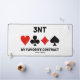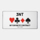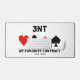 Bridge / duplicate bridge players who love playing game in 3NT (three no trump) will enjoy this desk mat featuring the four card suits along with the saying "3NT My Favourite Contract". Make others do a double-take with a dose of bridge game attitude with this memorable bridge saying desk mat!