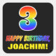 This colourful, fun, and cheerful birthday sticker design features a large number "3" and the message "HAPPY BIRTHDAY,", both coloured with a rainbow spectrum gradient inspired pattern, along with a bold yellow editable name. The background is coloured black. Fun stickers this might be used when wrapping a gift or present in honour of somebody’s third birthday, or perhaps may be given out to the attendees at a birthday celebration or party. [~Z0000480]