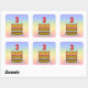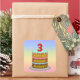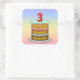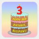 This colourful and joyful birthday square sticker design features a cartoon-style depiction of a three-tier birthday cake having a number-shaped candle on top showing the age “3“, along with the message “HAPPY 3RD BIRTHDAY,”, and an editable recipient name. The background features a multi-colour pastel rainbow spectrum inspired gradient pattern. Cheerful birthday themed stickers like these might be distributed or used at a party celebrating somebody’s 3rd birthday, or perhaps used when preparing invitations or gifts for such an event. [~Z0000624]