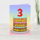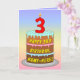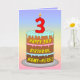 This joyful and colourful birthday greeting card design features a cartoon-style depiction of a three-tier birthday cake having a numeral-shaped candle on top showing the number “3“, along with the message “HAPPY 3RD BIRTHDAY,”, and a customizable recipient name. The background of the front has a multi-colour pastel rainbow spectrum inspired gradient pattern. The inside features a custom birthday greeting message, or could perhaps be cleared and left blank if a message is to be written by hand instead. A fun, personalized birthday greeting card like this might be a fun way to send some birthday wishes to somebody who is celebrating their third birthday. [~Z0000625]