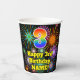 This joyful and exciting birthday themed paper cup design features a large number “3” with a rainbow spectrum gradient inspired pattern, along with the message “Happy 3rd Birthday,”, and a customizable name. The background features a colourful bursting celebratory fireworks inspired pattern. Colourful, vibrant paper cups like this might be fun to have at a birthday celebration/party being held in celebration of somebody’s third birthday. [~Z0000539]