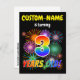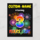 The front of this exciting and fun birthday party invitation postcard design features a personalized name, a vibrant bursting celebratory fireworks inspired pattern, and the message "3 YEARS OLD!" having a colorful rainbow spectrum inspired gradient pattern. The back features an editable message that could describe when and where the party is being held, in addition to other relevant information. Invitation postcards like this could be sent to potential attendees of a birthday party being held in celebration of somebody’s third birthday. [~Z0000452]
