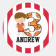 A cute basketball design for the 3rd Birthday of a future basketball player or basketball fan, featuring a large number three with basketballs inside it. A young basketball player wearing red and white and holding a basketball stands next to the number. Red and white stripes surround the outside of the sticker. Perfect for a 3rd Birthday gift or party favour. Visit CelebrationBazaar to view the collection of gifts, party favours and stationery featuing this cute basketball design. If the colour or year you require is not available, please contact us through the store to make your request.