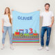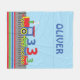 Our colourful 3rd birthday blanket showcases a delightful train carrying three number threes! Personalize with the name of the young boy. The background is set in a sky blue. Perfect gift for the boy to cozy up to on his bed or while watching TV. Colourful stripes at the bottom, reflect the bright, fun colours of the train.