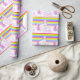 Unicorn watercolor rainbow stripe patterned third birthday wrapping paper. Personalize with your own name, currently reads Happy Birthday Charlotte Three. Cute whimsical chantering unicorn painting and design by Sarah Trett www.sarahtrett.com for www.mylittleeden.com on zazzle.