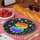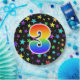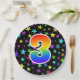 This colourful, cheerful, and fun paper plate design features a large number "3" having a rainbow spectrum gradient inspired pattern colouring. The background features a colourful pattern of star shapes. Paper plates like this might be used at a party celebrating somebody’s 3rd birthday, or a couple’s third anniversary, or some other third event. [~Z0000493]