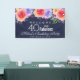 Birthday welcome banner with a pretty bouquet of watercolor roses and other colourful sprigs, leaves and branches stretching across the top of the banner. Set on a navy blue background. Text says: 40 and fabulous, thank you for coming, along with your personalized event info.