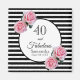 A magnet for a 40th birthday party. Classic slim black and white horizontal stripes as background. With girly and feminine pink roses as decoration.