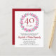 This budget invitation for 40th wedding anniversary features a delicate floral wreath made of wild pink flowers and green leaves. Invitation can be easily personalized with your special ruby anniversary information. Back of the invitation features a matching floral garland framing the anniversary dates in elegant white text on a ruby red background. Matching party supplies and stationery are available in "40th Wedding Anniversary Pink Flowers" collection.