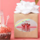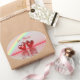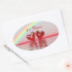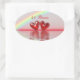 Oval stickers with my original artwork of a rainbow and two ruby coloured hearts floating on the water. Customizable text says "40 Years".