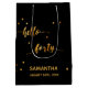 Elegant and modern for a 40th birthday party. Black backdrop and faux gold text written with a trendy hand-lettered style script: hello forty. With golden dots as decor. Templates for name and date, golden letters.