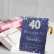 A welcome sign for a 40th birthday party. A navy blue background with elegant faux silver stars. The blue colour is uneven. Personalize and add a name and text. White letters.