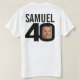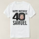 Happy 40th Birthday black and white text, custom front, and back photo, and name t-shirt. Fun 40th personalized photo in bold black and contrasting white birthday tee design. Personalize this birthday shirt with two photographs of the birthday person in the middle of the number 0 on the front and back ideal for a past and present photo opportunity. Great idea for adding some fun to a milestone fortieth birthday party, event, wave, or birthday drive by. Other matching items and colours are available. Exclusive design by Sarah Trett for www.mylittleeden.com
