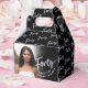 Forty silver script two photos party favour boxes. Personalize this 40th birthday party script photo favour box with your own birthday girls name and two photos of your birthday girl or boy one on each side. Other years and matching items are available and can be created by request. © Original design by Sarah Trett for www.mylittleeden.com on Zazzle.