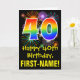 The front of this colorful, exciting, and fun birthday-themed greeting card design features a large number "40" with a rainbow spectrum gradient inspired pattern, along with the message "Happy 40th Birthday,", and an editable recipient name. The front additionally features a colorful background pattern inspired by bursting celebratory fireworks. The inside features a customized birthday greeting message, or could perhaps be cleared and left blank if a message is to be written by hand instead. A personalized birthday card like this might be a fun way to acknowledge somebody’s fortieth birthday. [~Z0000442]