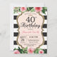 40th Birthday Invitation for women. Black and Gold Birthday Party Invite. Gold Glitter. Pink Watercolor Floral Flower. Black and White Stripes. Printable Digital. For further customization, please click the "Customize it" button and use our design tool to modify this template.