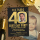 Bold simple graphic black, and gold photo template 40th birthday party invitation. Personalize this milestone birthday invitation with your own birthday party event details, and a photos of your birthday boy or girl in the centre of the 0 in 40 and one full bleed out photo on the reverse, great for a now and then photo opportunity. Other years colours and matching items are available. © Original design by Sarah Trett for www.mylittleeden.com on Zazzle.
