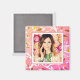 An elegant and modern botanical pattern of branches and leaves in pink green, and white as background. A slim white frame and template for Your photo. White text overlay: Hello 40! A magnet for a girly 40th birthday party.