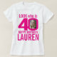40th birthday pink on white, look who is 40 custom photo and name t-shirt. Fun 40th personalized photo black and white birthday tee design. Personalize this birthday shirt with a photograph of the birthday girl in the middle of the number 0. Great idea for adding some fun to a milestone fiftieth birthday gift. Other matching items and colours are available. Exclusive design by Sarah Trett for www.mylittleeden.com