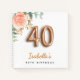 For an elegant and feminine 40th birthday party. A chic white background. Decorated with a rose gold and blush pink watercolored rose flower, floral, green eucalyptus leaves, sprigs, greenery and faux gold sprigs. Personalize and a name. Black and golden letters. The name is written with a modern hand lettered style script. Number 40 is written with a golden balloon style font. Can be used as a guest book or for planning the party.