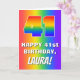 The front of this fun and cheerful birthday themed greeting card design features a large number “41” having a rainbow spectrum inspired gradient pattern. It also features the message “HAPPY 41st BIRTHDAY,”, and a personalized name. The background of the front also has a vibrant multicolored rainbow spectrum gradient pattern. The inside has a customized birthday greeting message, or could perhaps be cleared and left blank if a message is to be written by hand instead. A cheerful, editable birthday greeting card like this might be sent in celebration of somebody’s forty-first birthday. [~Z0000570]