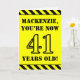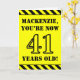 The front of this attention-grabbing and fun birthday-themed greeting card design features a personalized name and the message "YOU’RE NOW 41 YEARS OLD!" in black stencil look text on a yellow colored background. There is also an eye-catching yellow and black striped pattern at the top and bottom edges of the front. The inside features a customized birthday greeting message, or could perhaps be cleared and left blank if a message is to be written by hand instead. A customizable birthday card like this might be a fun way to acknowledge somebody’s forty first birthday. [~Z0000413]