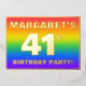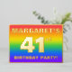 The front of this vibrant forty-first birthday celebration/party foil invitation card design features an editable name, a large number “41st”, the message “BIRTHDAY PARTY!”, and a border. The background of the front has a fun, multicolored, rainbow spectrum inspired gradient pattern. The back features personalized details about the event, such as the date, time, location, and any other important information. Editable invitations like these might be a fun way to invite attendees/guests to a birthday party/gathering being held to honour somebody’s 41st birthday. [~Z0000599]
