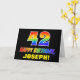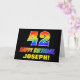 The front of this colorful, fun, and cheerful birthday greeting card design features a large number "42" and the message "HAPPY BIRTHDAY,", both colored with a rainbow spectrum gradient inspired pattern, along with a bold yellow editable recipient name. The front also has a minimalist, plain, black colored background. The inside has a personalized birthday greeting message, or could perhaps be cleared and left blank if a message is to be written by hand instead. A vibrant personalized birthday card like this might be a fun way to acknowledge somebody’s forty second birthday. [~Z0000472]