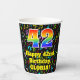 This colourful and cheerful music-themed birthday paper cup design features a large number “42” with a rainbow spectrum gradient inspired pattern, along with the message “Happy 42nd Birthday,”, and an editable name. The background features an exciting and colourful pattern having music notes and symbols of various colours and sizes. Colourful, vibrant paper cups like this might be fun to use at a birthday celebration/party being held in celebration of somebody’s 42nd birthday. [~Z0000541]