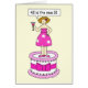 Cartoon of a lady in pink, standing on a large pink and white cake holding a cocktail and saying '42 is the new 32'.