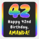 This upbeat and exciting birthday themed square sticker design features the number “42“ with a multicolored rainbow spectrum inspired gradient pattern, along with the message “Happy 42nd Birthday,”, and a custom recipient name. Stickers like these might be used or distributed at a party held in celebration of somebody’s 42nd birthday, or perhaps used when wrapping gifts or preparing invitations for such an event. [~Z0000630]
