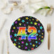 This colourful, cheerful, and fun paper plate design features a large number "42" coloured with a rainbow spectrum gradient inspired pattern. The background features a pattern of colourful star shapes. Paper plates like this might be fun to use at a party being held to celebrate somebody’s forty second birthday, or a couple’s forty second anniversary, or some other forty second event. [~Z0000493]