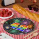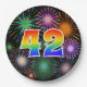 This cheerful, fun, and colourful paper plate design features a large number "42" having a rainbow spectrum gradient inspired pattern colouring. It also features a vibrant and exciting bursting celebratory fireworks inspired pattern. The background is coloured black. Paper plates like this might be fun to use at a party being held to celebrate somebody’s 42nd birthday, a 42nd anniversary, or some other forty second event. [~Z0000490]