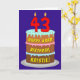 This fun and joyful birthday greeting card design features a depiction of a three-tier birthday cake having number-shaped candles on top showing the age “43“, along with the message “HAPPY 43RD BIRTHDAY,”, and a customizable recipient name. The inside features a personalized birthday greeting message, or could perhaps be cleared and left blank if a message is to be written by hand instead. A cheerful, customized birthday greeting card like this might be used to celebrate somebody’s forty-third birthday. [~Z0000620]