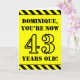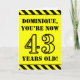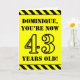 The front of this attention-grabbing and bold birthday-themed greeting card design features a personalized name and the message "YOU’RE NOW 43 YEARS OLD!" in black stencil look text on a yellow coloured background. The front also features an eye-catching yellow and black stripes pattern at the top and bottom edges. The inside features an editable birthday greeting message, or could perhaps be cleared and left blank if a message is to be written by hand instead. A birthday card like this might be a fun way to send birthday wishes to somebody who is celebrating their forty third birthday. [~Z0000413]