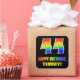 This fun, colourful, and cheerful birthday-themed sticker design features a large number "44" and the message "HAPPY BIRTHDAY,", both coloured with a rainbow spectrum gradient inspired pattern, along with a bold yellow customizable name. The background is coloured black. Fun birthday themed stickers like this could be used when wrapping a gift or present being given to celebrate somebody’s forty fourth birthday, or perhaps might be given out to the attendees at a birthday celebration. [~Z0000480]