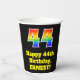 This fun and colourful birthday-themed paper cup design features a large number “44” having a rainbow spectrum gradient inspired pattern. It also features the message “Happy 44th Birthday,”, and a customizable name. It also has a black-coloured background. Vibrant, colourful paper cups like this might be fun to have at a birthday party/celebration being held to celebrate somebody’s forty fourth birthday. [~Z0000537]