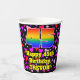 This colourful and cheerful birthday-themed paper cup design features a large number “45” having a rainbow spectrum gradient inspired pattern. It also features the message “Happy 45th Birthday,”, and an editable name. The background features a pattern of purple, red, and pink heart shapes of various sizes. Joyful, friendly paper cups like this might be fun to have at a birthday party being held to celebrate somebody’s 45th birthday. [~Z0000548]