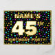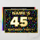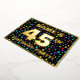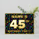 The front of this upbeat forty-fifth birthday party/celebration foil invitation card design features an editable name, a large number “45th”, the message “BIRTHDAY PARTY!”, and a border. The background of the front features an exciting, multicolored pattern of star shapes. The back features personalized details about the event, such as the date, time, location/venue, and any other useful information. Editable invitations like these might be a fun way to invite attendees/guests to a birthday gathering being held to honour somebody’s 45th birthday. [~Z0000600]