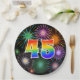 This fun, cheerful, and colourful paper plate design features a large number "45" coloured with a rainbow spectrum gradient inspired pattern. It also features a vibrant and exciting bursting celebratory fireworks inspired pattern. It has a black coloured background. Fun paper plates like this might be used at somebody’s forty fifth birthday party, a forty fifth anniversary celebration, or some other forty fifth event. [~Z0000490]