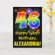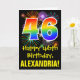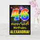 The front of this exciting, fun, and colourful birthday greeting card design features a large number "46" with a rainbow spectrum gradient inspired pattern, along with the message "Happy 46th Birthday,", and a customizable recipient name. The front additionally has a colourful bursting celebratory fireworks inspired background pattern. The inside features a customizable birthday greeting message, or could perhaps be cleared and left blank if a message is to be written by hand instead. A customizable birthday card like this might be a fun way to celebrate somebody’s forty sixth birthday. [~Z0000442]