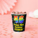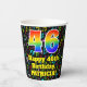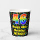This exciting and colourful music-themed birthday paper cup design features a large number “46” with a rainbow spectrum gradient inspired pattern, along with the message “Happy 46th Birthday,”, and an editable name. The background features a multicolored pattern of various music notes and symbols having a variety of colours and sizes. Vibrant, colourful paper cups like this might be fun to use at a birthday celebration being held to celebrate somebody’s forty sixth birthday. [~Z0000541]