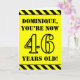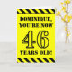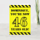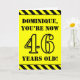 The front of this attention-grabbing and fun birthday-themed greeting card design features a customizable name and the message "YOU’RE NOW 46 YEARS OLD!" in black stencil style text on a yellow coloured background. The front also features an eye-catching black and yellow stripes pattern at the top and bottom edges. The inside features an editable birthday greeting message, or could perhaps be cleared and left blank if a message is to be written by hand instead. A customizable birthday card like this might be a fun way to send a message in celebration of somebody’s forty sixth birthday. [~Z0000413]