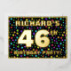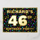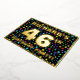 The front of this fun and vibrant forty-sixth birthday party foil invitation card design features a custom name, a large number “46th”, the message “BIRTHDAY PARTY!”, and a border. The background of the front has a joyful, multicolored stars pattern. The back features personalized details about the event, such as the date, time, location/venue, and any other useful information. Customizable invitations like these might be a fun way to invite attendees/guests to a birthday party/gathering being held to celebrate somebody’s 46th birthday. [~Z0000600]