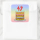 This joyful and colourful birthday themed square sticker design features a cartoon-style depiction of a three-tier birthday cake having numeral-shaped candles on top showing the number “47“, along with the message “HAPPY 47TH BIRTHDAY,”, and an editable recipient name. The background has a multi-colour pastel rainbow spectrum inspired gradient pattern. Stickers like these might be used or distributed at a birthday party held for somebody who is celebrating their forty seventh birthday, or perhaps used when preparing gifts or invitations for such an event. [~Z0000624]